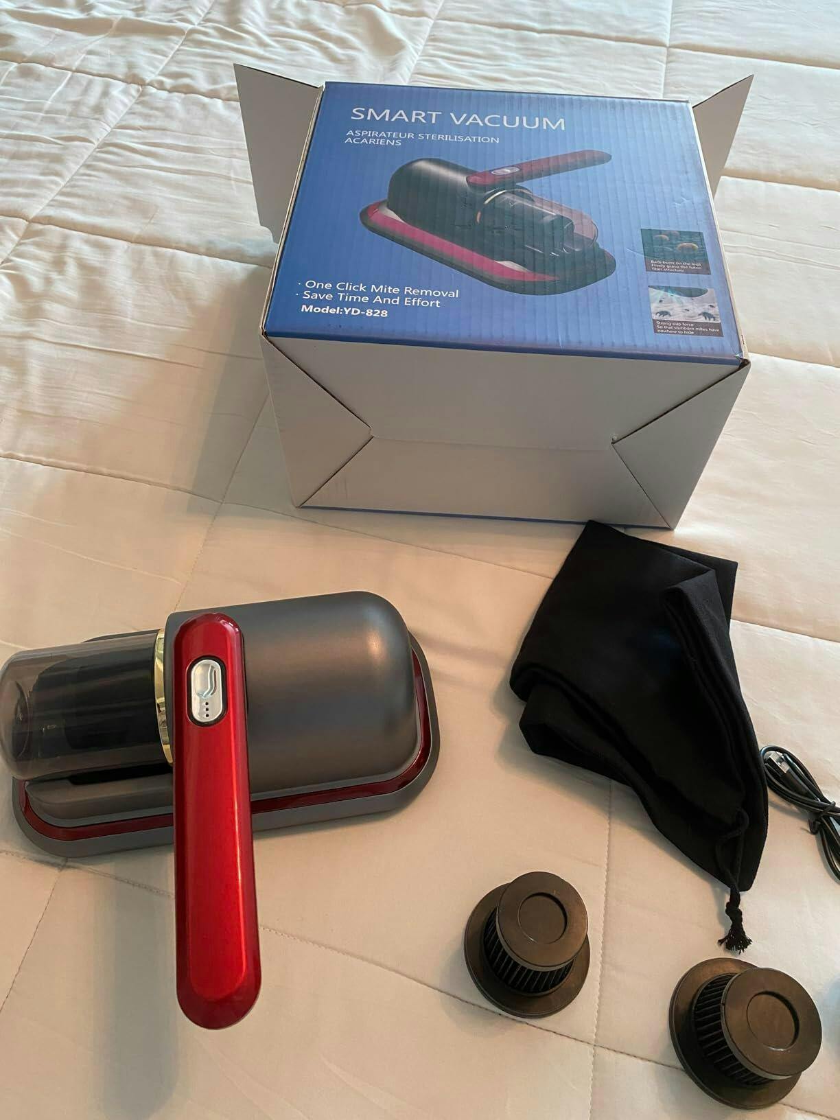 This little hand vac is specifically for your mattress or comforter on top. It's lightweight, 2.5 lbs and it's cordless. It has a HIPAA filter on it and it comes with three little filters and a bag to put it in. And for vacuum cleaner it's not at all expensive. You use this little vacuum cleaner to clean your mattresses, top comforters and pillows. It picks up dust and dirt and pet hair and skin particles even bed bugs. It has a purple light technology which clean your bed hygienically. It does a great job on cottons and percale, but on the micro fiber it appears to do only so-so. I tried it on my microfiber pillowcase and sheets and it only got some of the pet hairs and dust off of them. It's very quiet otherwise it seems to work very nice. He gets all that pet hair off of your comforter in your sheets even the carpets in your sofa works great on sofas and chairs. Especially with that pet hair. You can wash the dust box and the filter and let them dry and replace them and use them again and again. It's very easy to remove, you just twist it a little bit and it pops right off. But if you're doing a lot of work and rinse one filter you can use one of the others. You can even travel with this one and clean those beds that you have got to sleep in those motels it's not so meticulous. The ones you have to settle for because everything else is full. I recommend you buy this mattress vacuum to do all your beds and chairs and sofas. It'll be so much healthier and safer. And it'll feel so much cleaner.